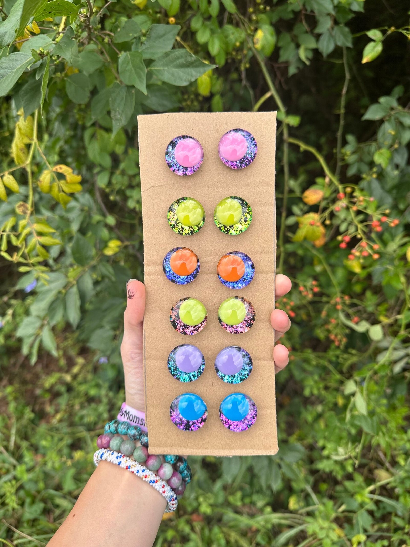 This is a listing for 6 sets of rainbow kawaii pupil safety eyes. These safety eyes are handpainted by myself. There are pink, yellow, orange, green, and blue holographic eyes. Check out the video above to see how the colors change. These eyes are 24mm each pair includes two backs. If you have any questions, feel free to message me.