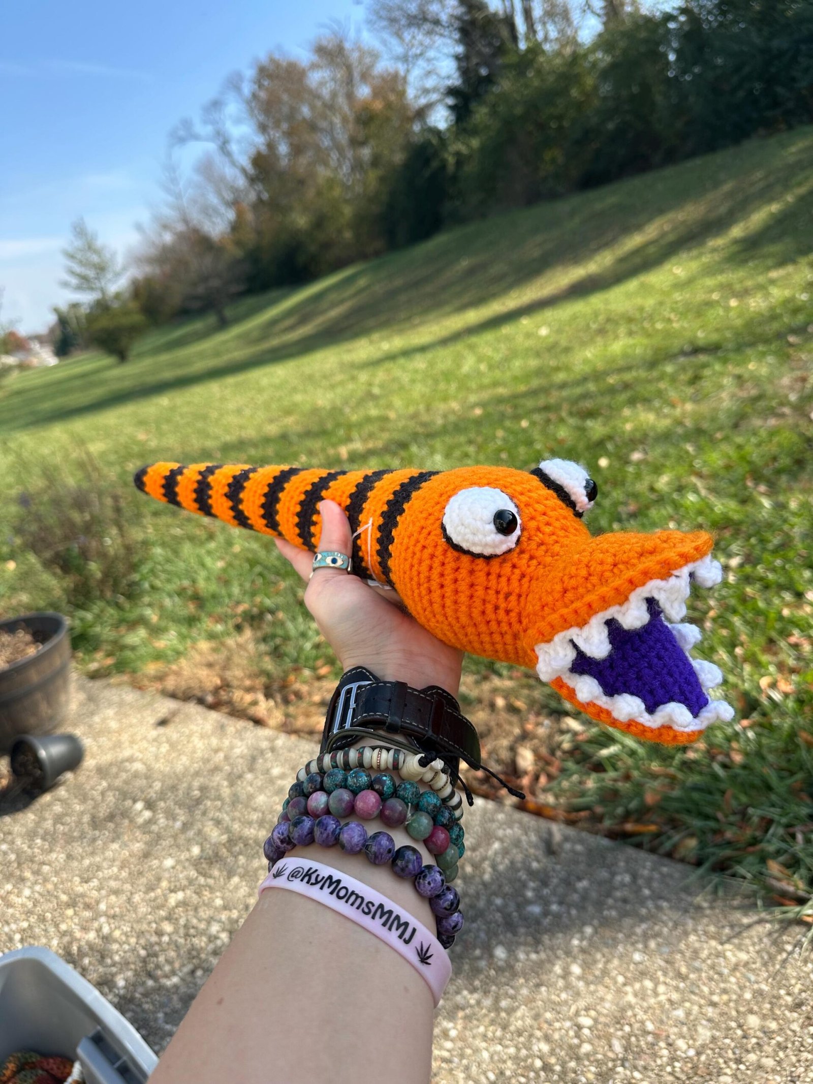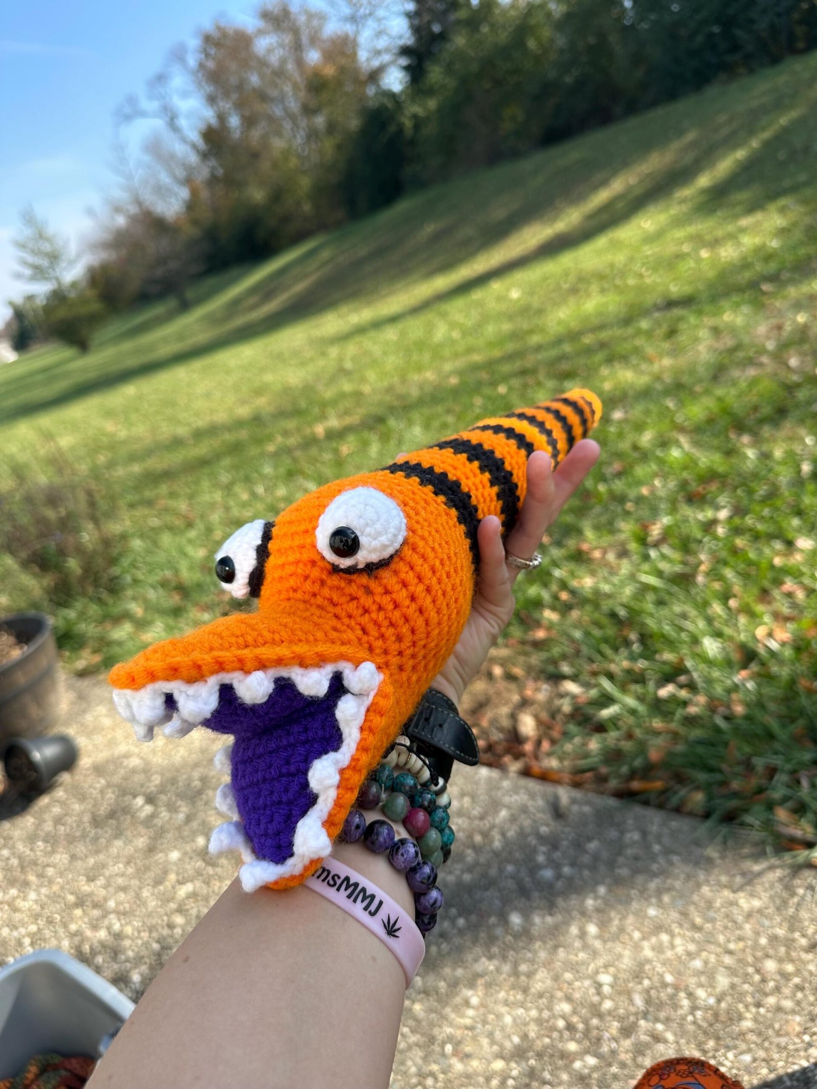 Channeling the whimsical, eerie vibes of Tim Burton’s iconic aesthetic, this handmade striped snake plush is a quirky addition to any collection. Crocheted with care and attention to detail, this snake features bold orange and black stripes, oversized expressive eyes, and a vibrant purple mouth lined with soft, jagged “teeth.” It’s a delightful piece of darkly playful decor that’s perfect for fans of unconventional, spooky charm. Display it on a shelf, gift it to a Tim Burton enthusiast, or add it to your own collection of unique plushies for a touch of delightful weirdness.