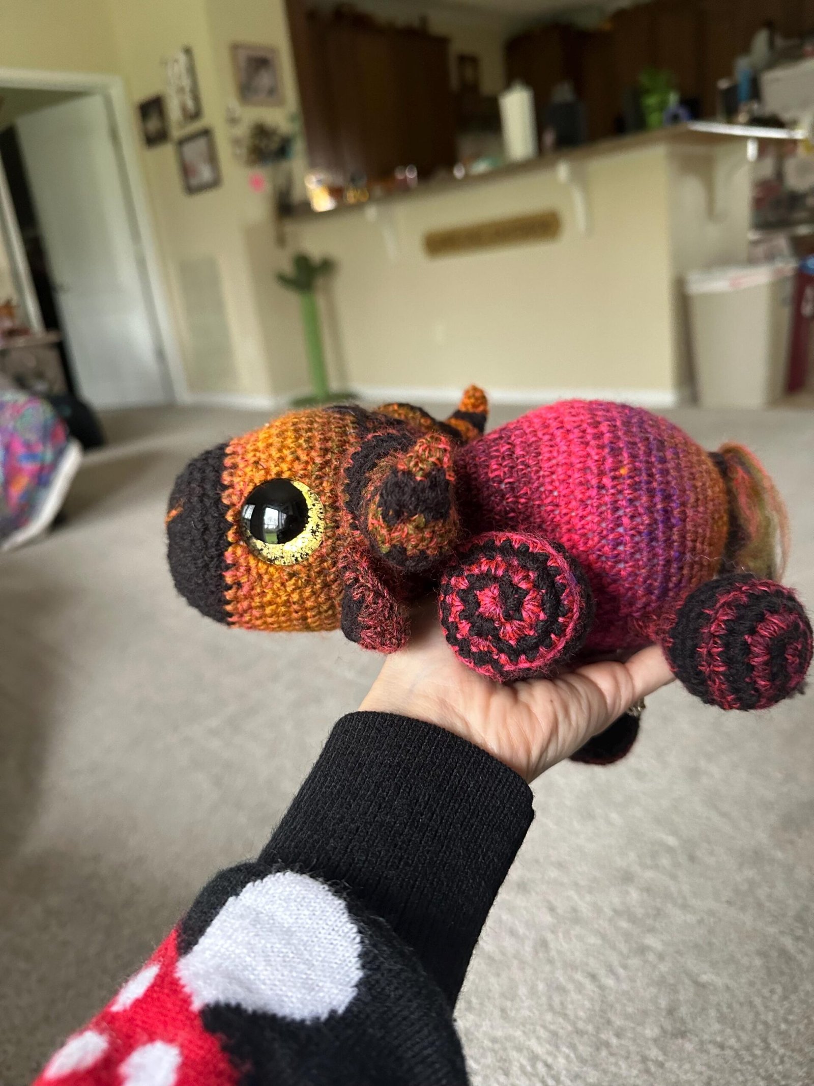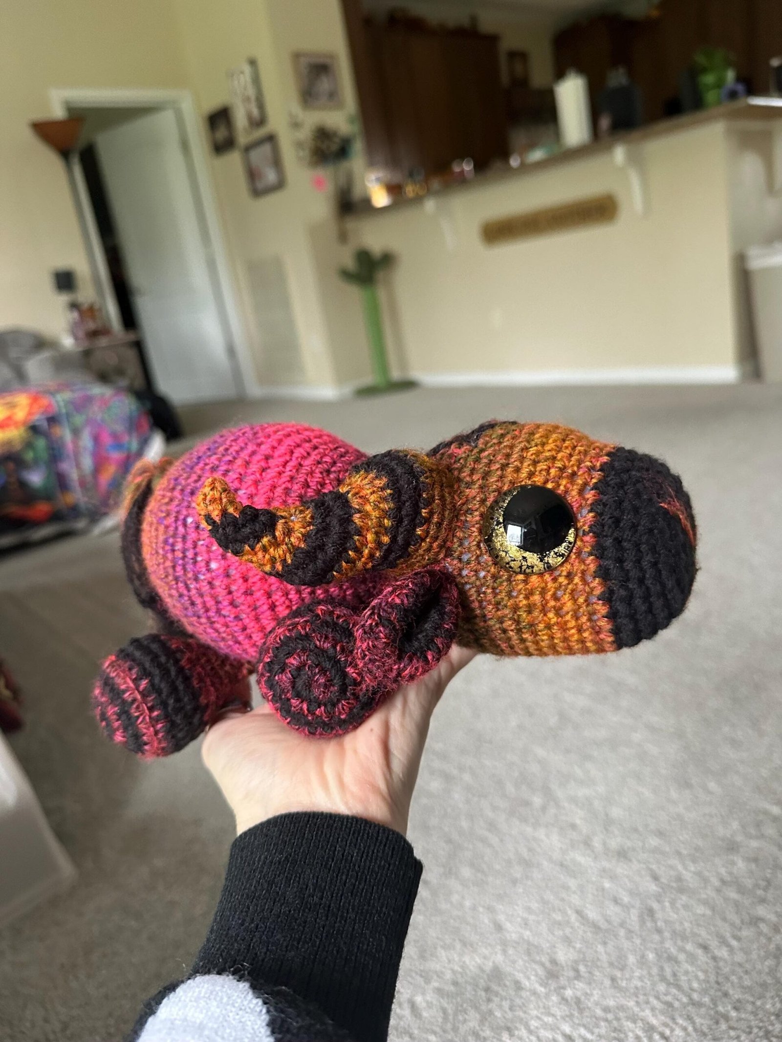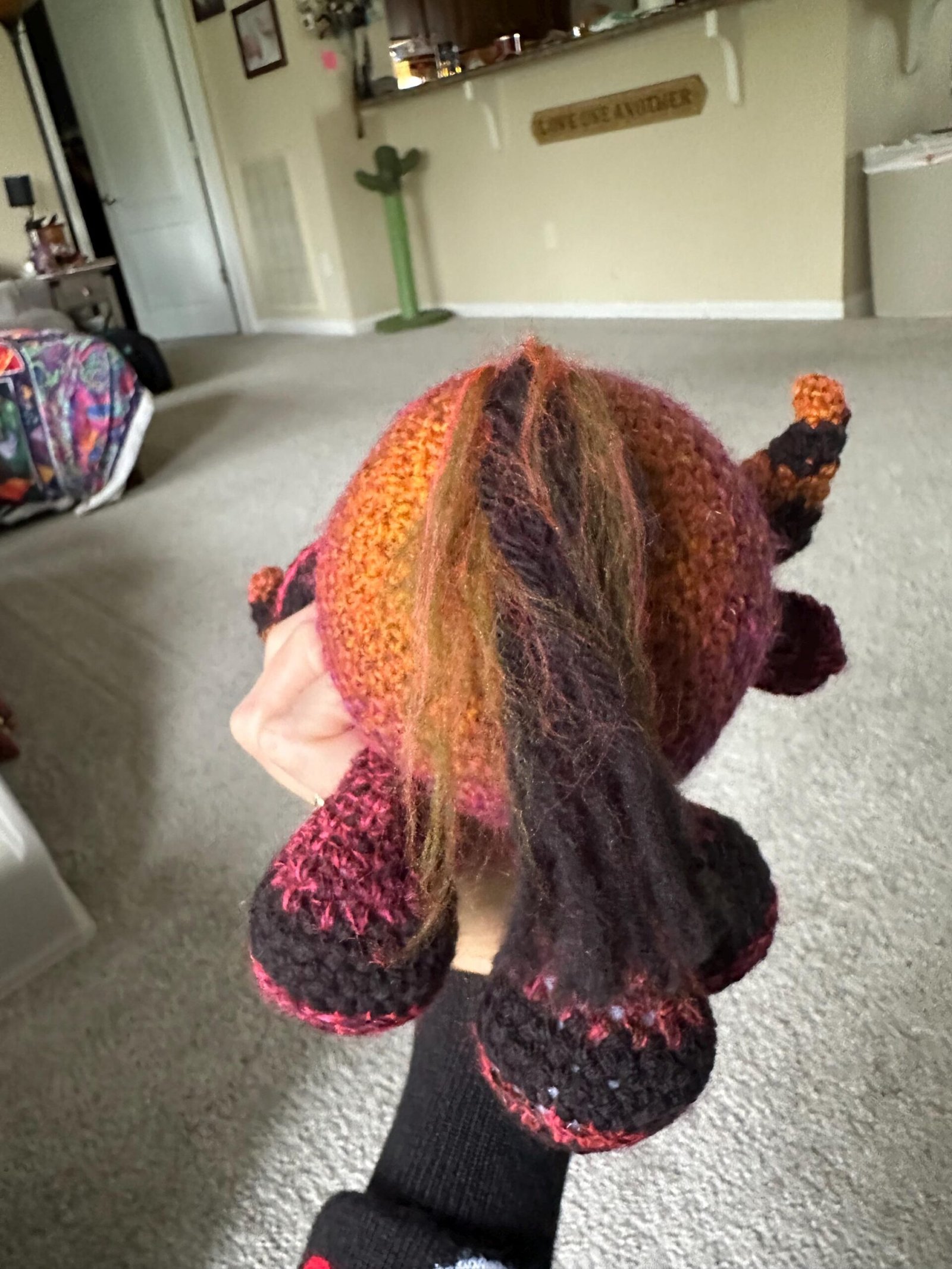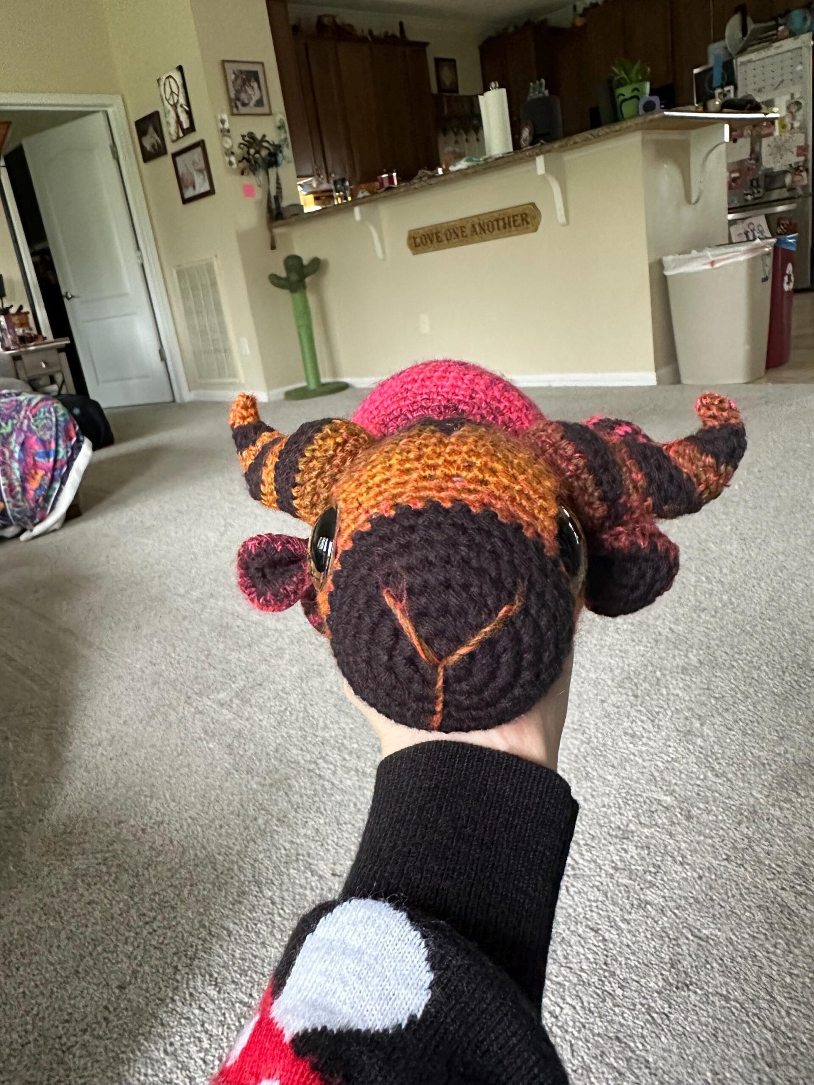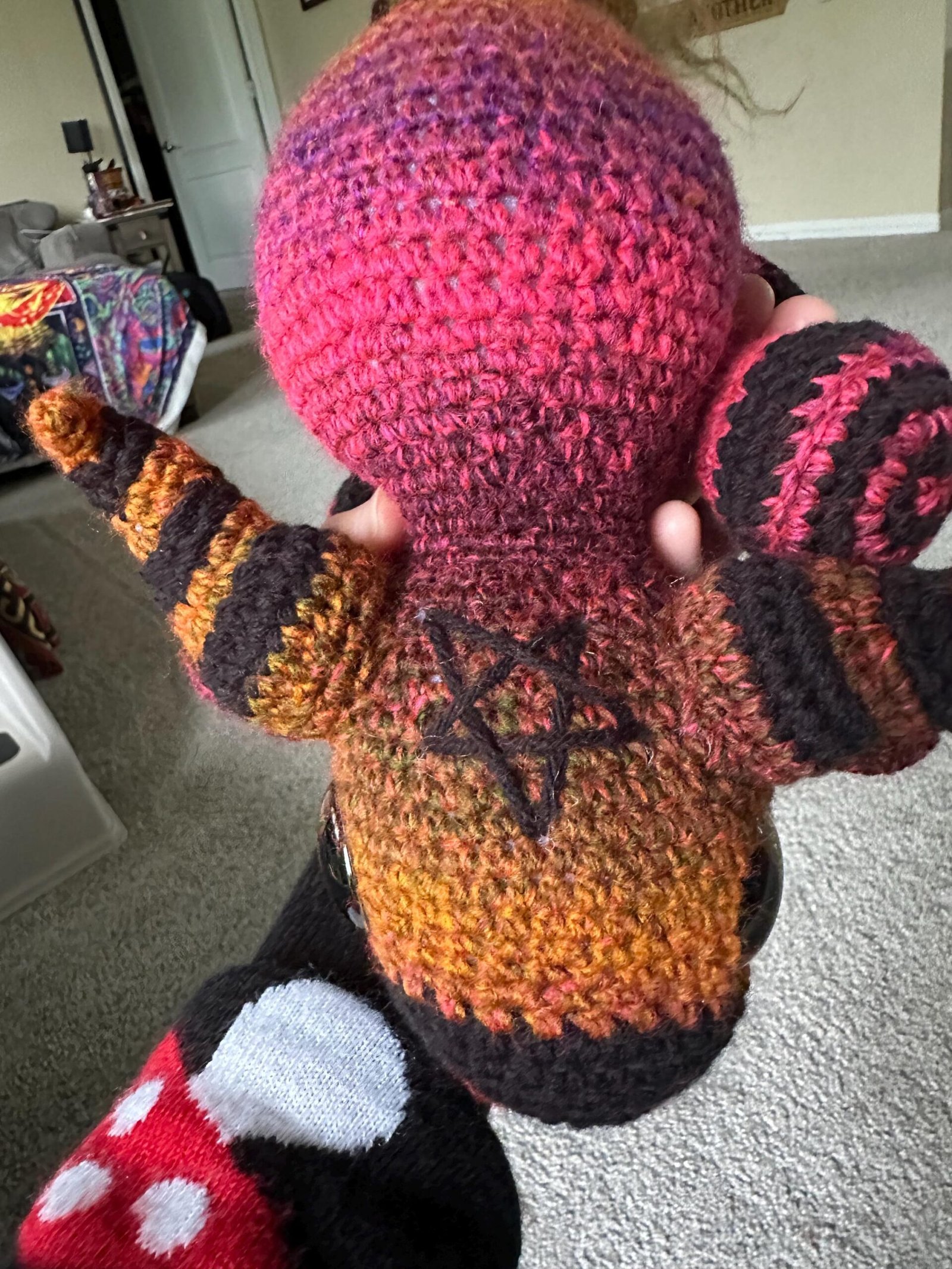 Introducing a one-of-a-kind, handmade Baphomet plush with a unique twist! This crochet plush captures the mystique of Baphomet in a cozy, laying-down position, making it both intriguing and approachable. Crafted with richly colored yarn in warm, earthy tones, this plush features expressive hand-painted eyes that add depth and personality to its look.