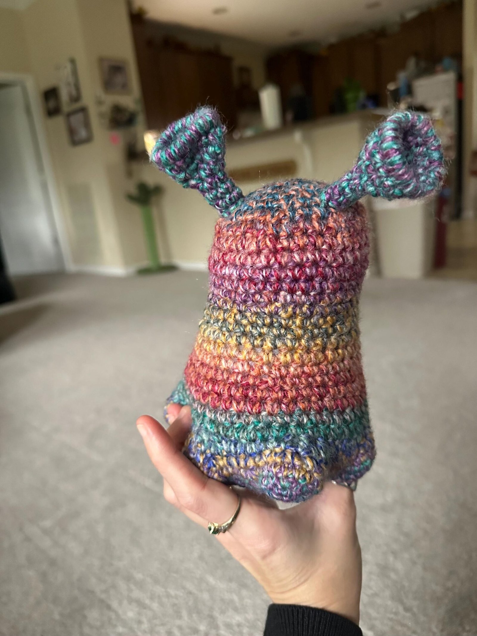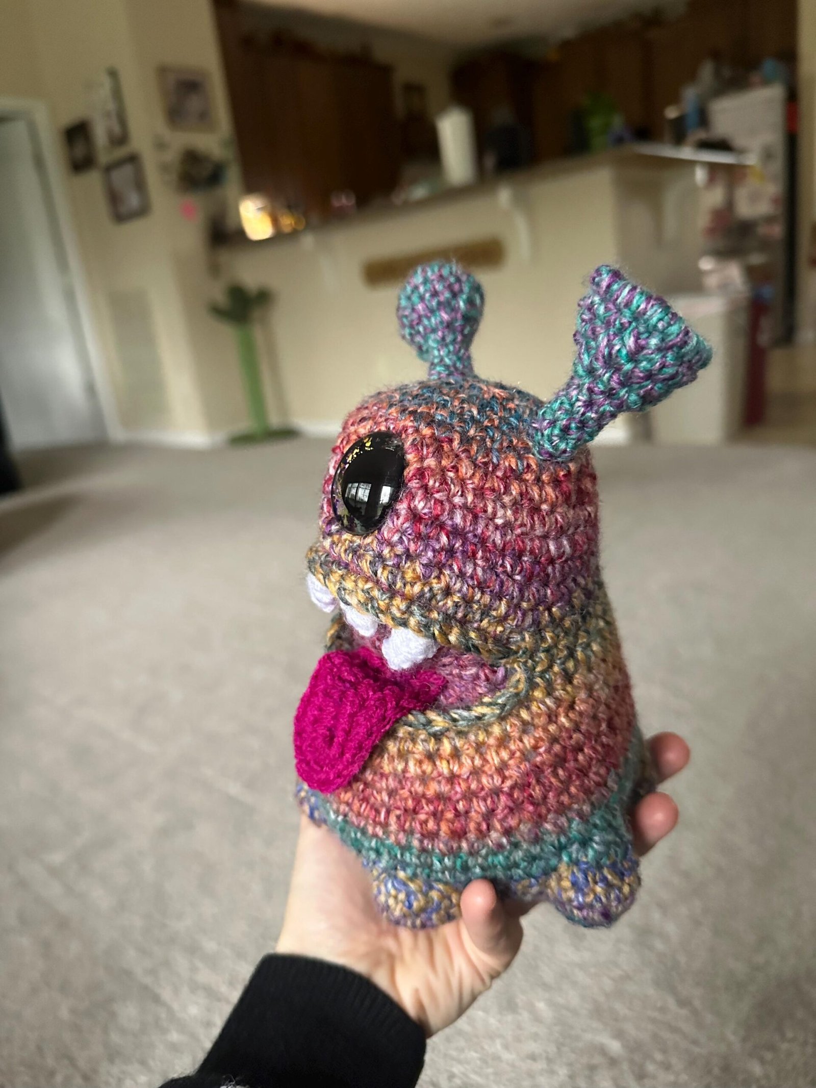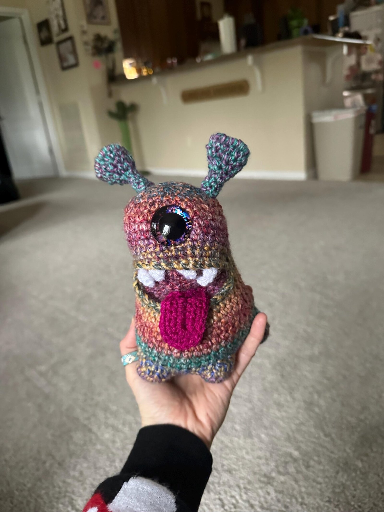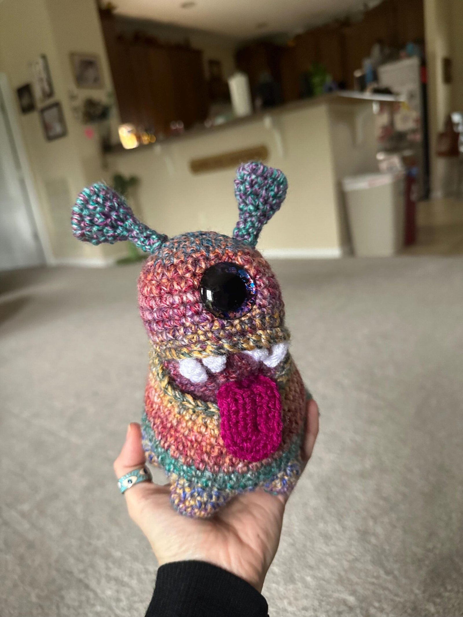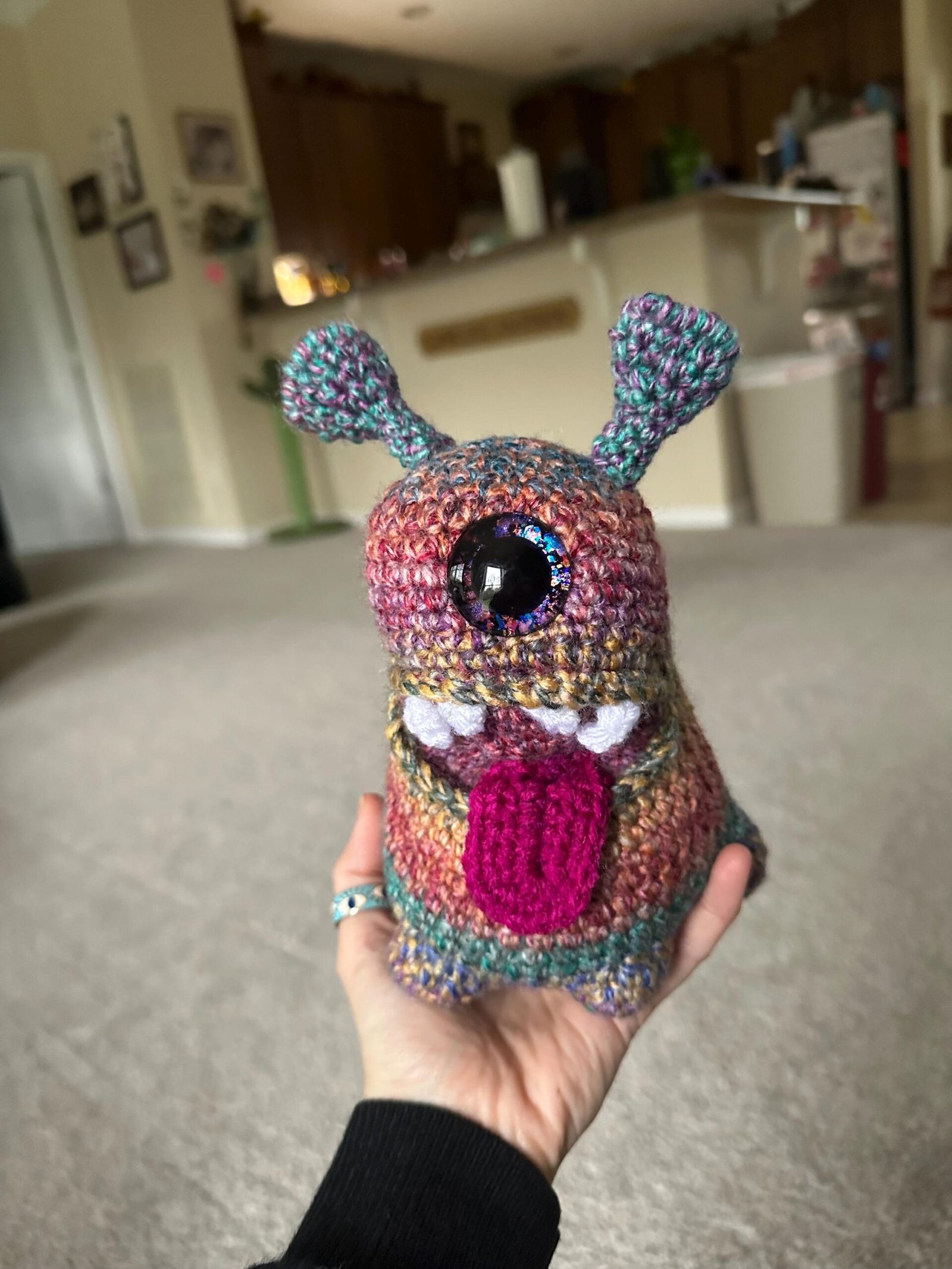 Add a splash of playful energy to your collection with this delightful blob monster! This handmade creature is full of character, from its unique single eye—meticulously hand-painted for that extra touch of life—to its cheeky pink tongue sticking out in a charmingly goofy expression. With soft, multicolored yarn that creates a whimsical blend of hues, this little monster feels right at home perched on a shelf, nestled among plush friends, or as a quirky desk companion.