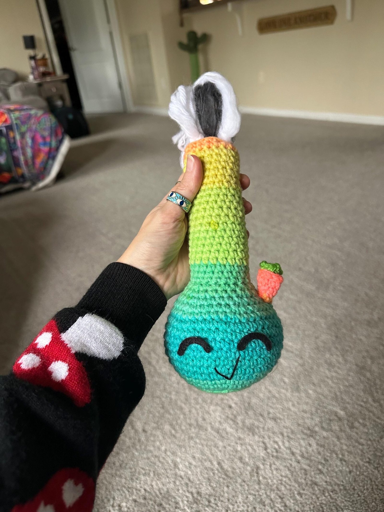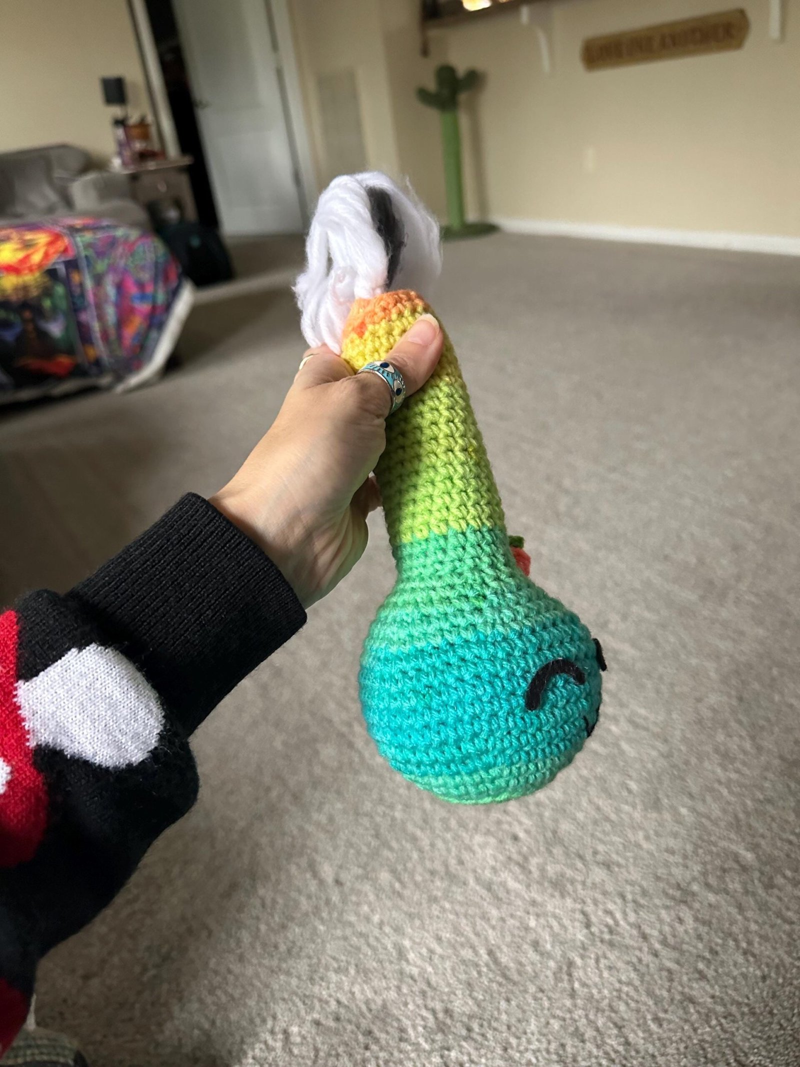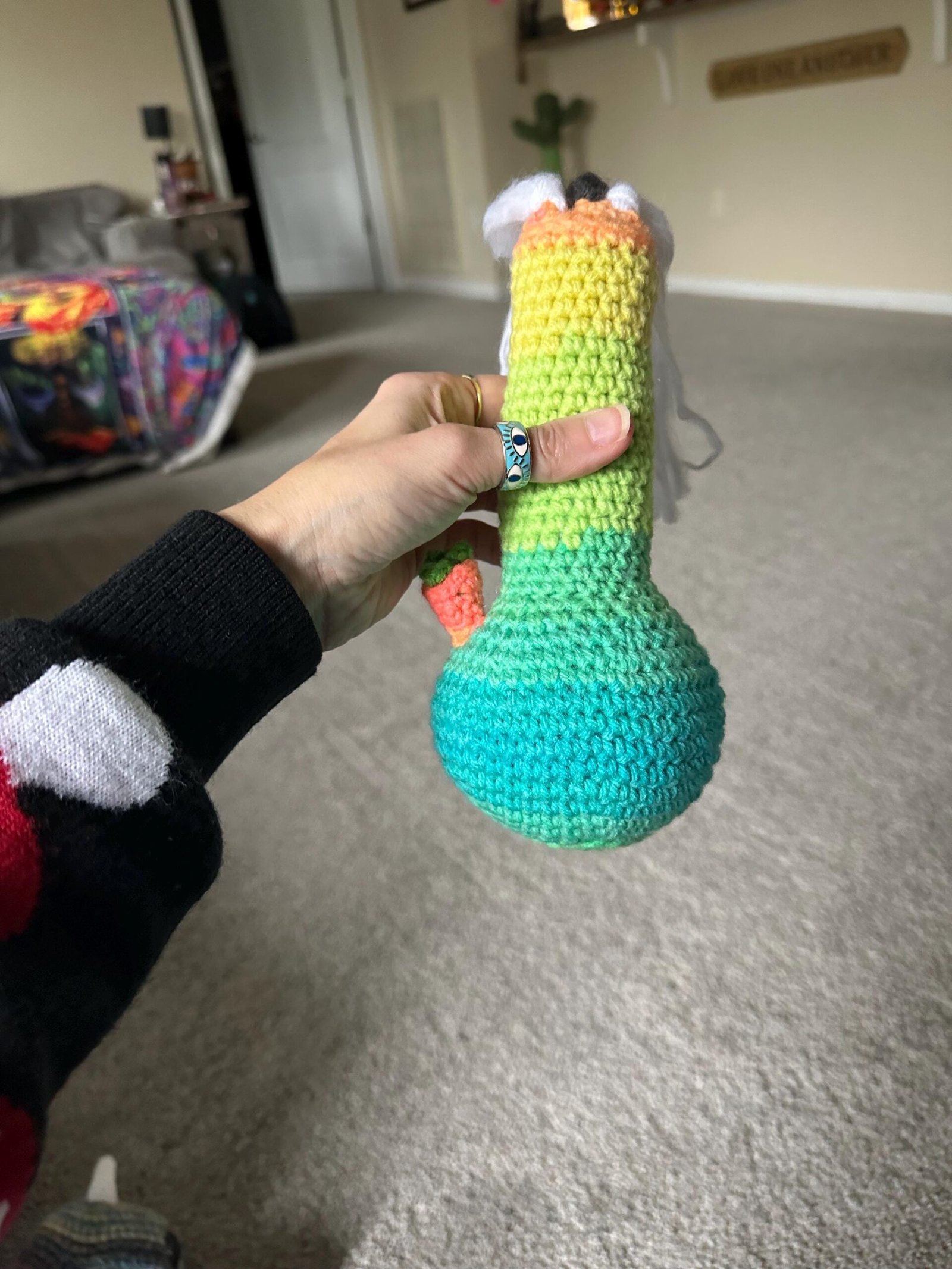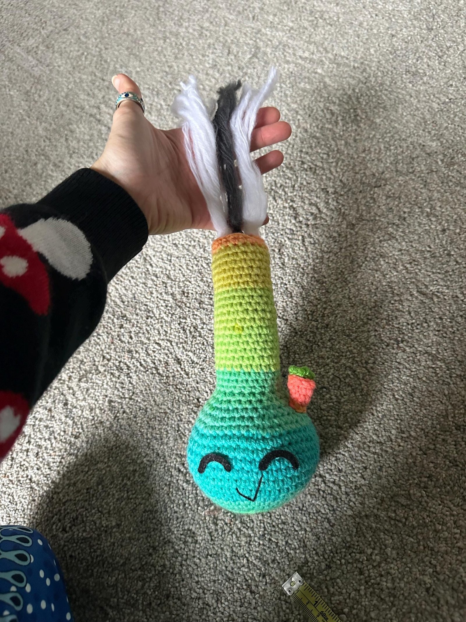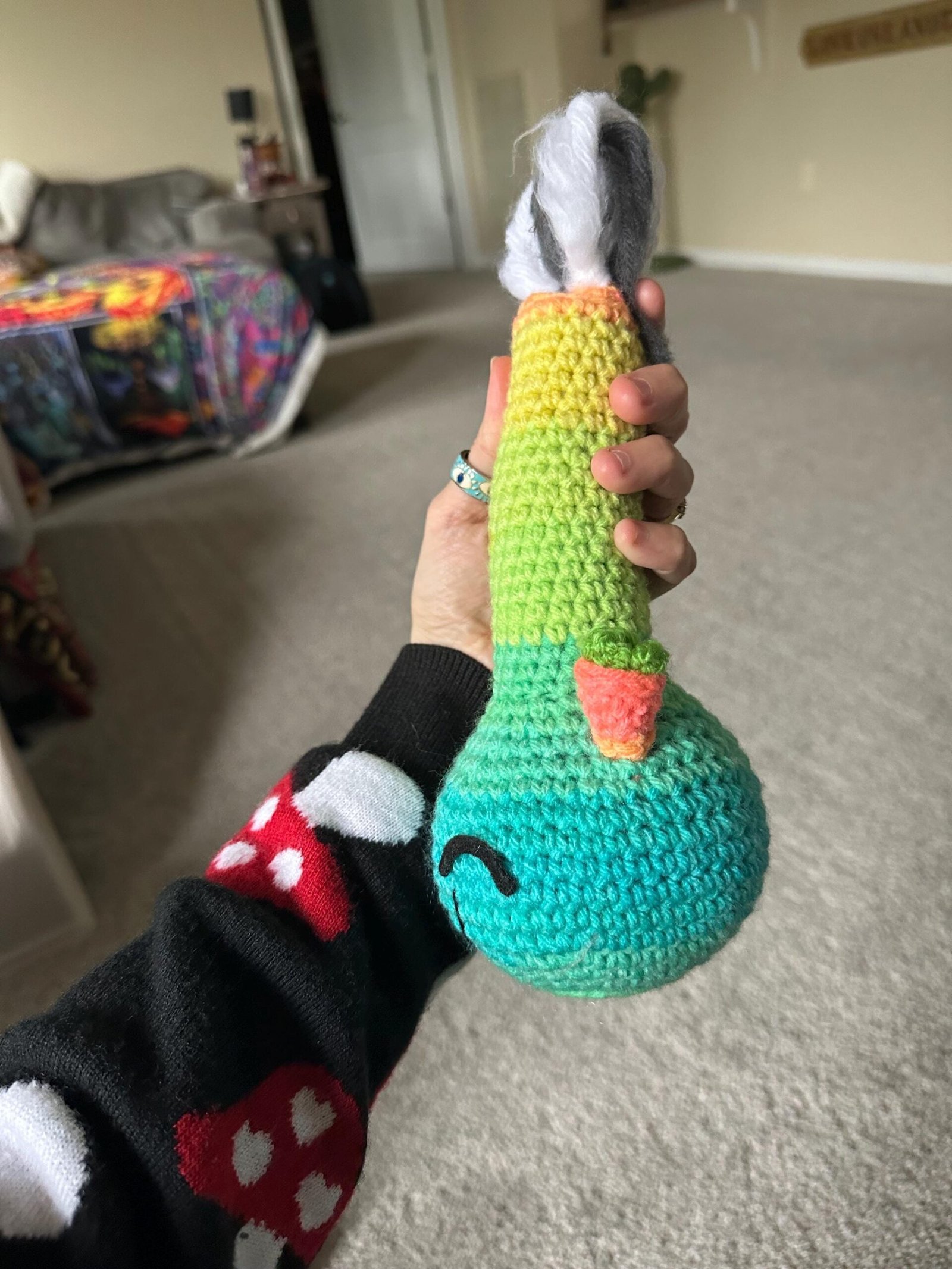 Have your very own crochet bong! He has cute little closed felt eyes and a crooked smile. He’s made using a multi colored yarn of blue, green, yellow and orange. He has yarn that is brushed out at the top that is supposed to look like smoke.