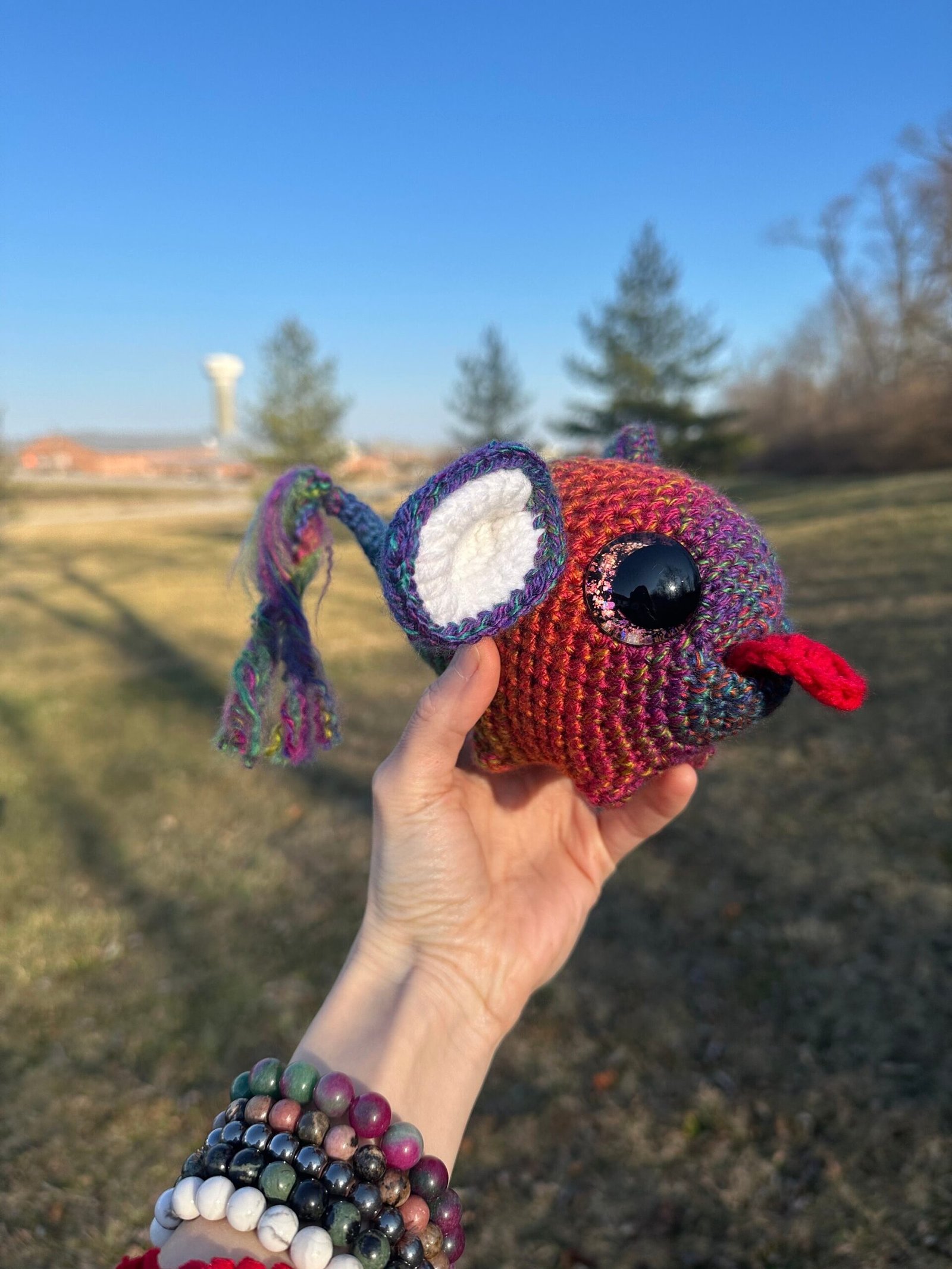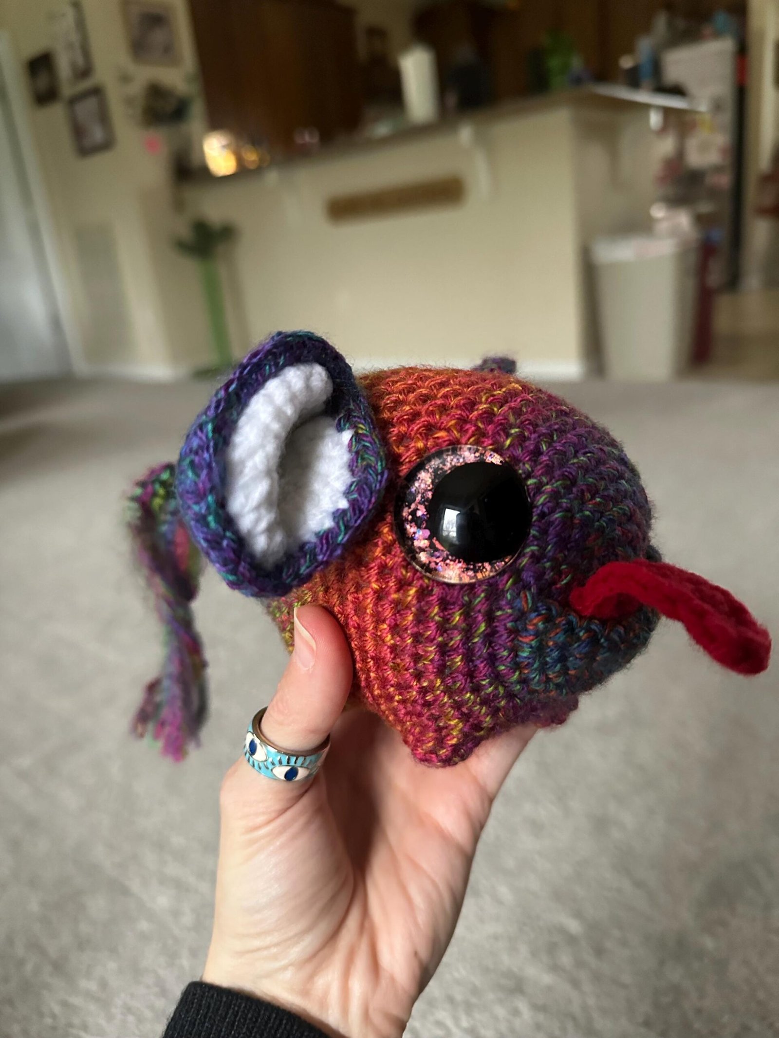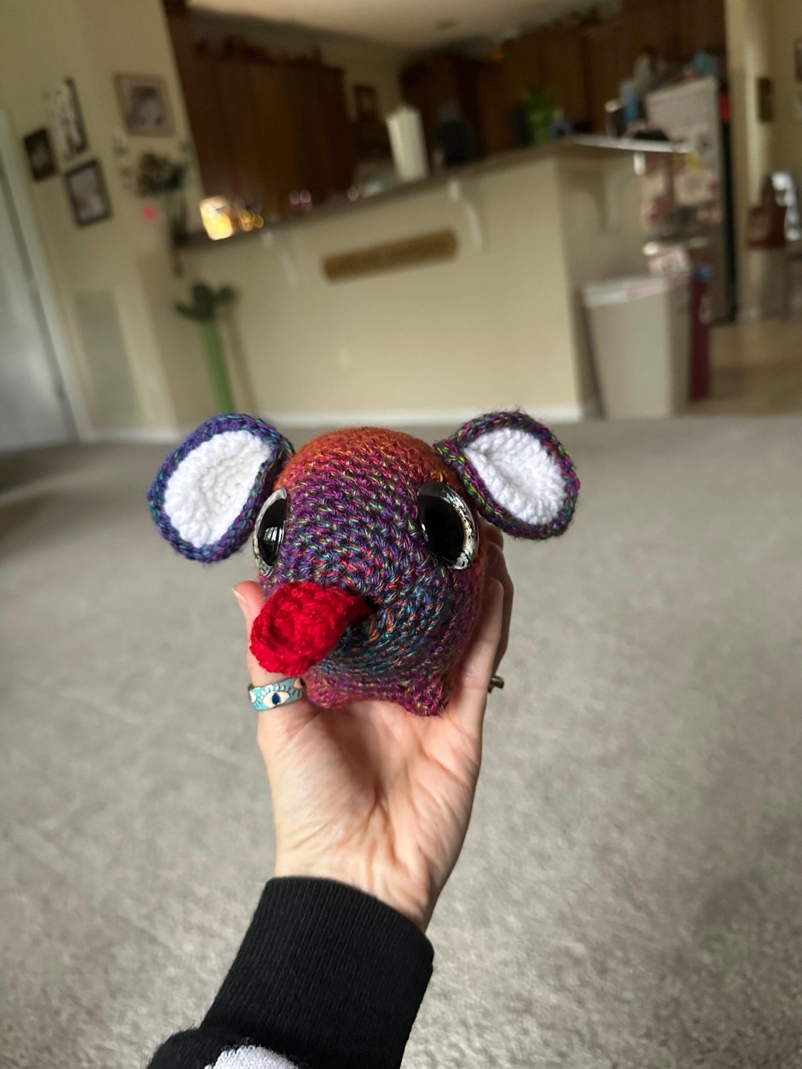 He’s super cute with multi colored yarn colored with a red tongue and adorable mouse ears. He has amazing holographic eyes painted by myself. This item is NOT meant to be a child’s toy.