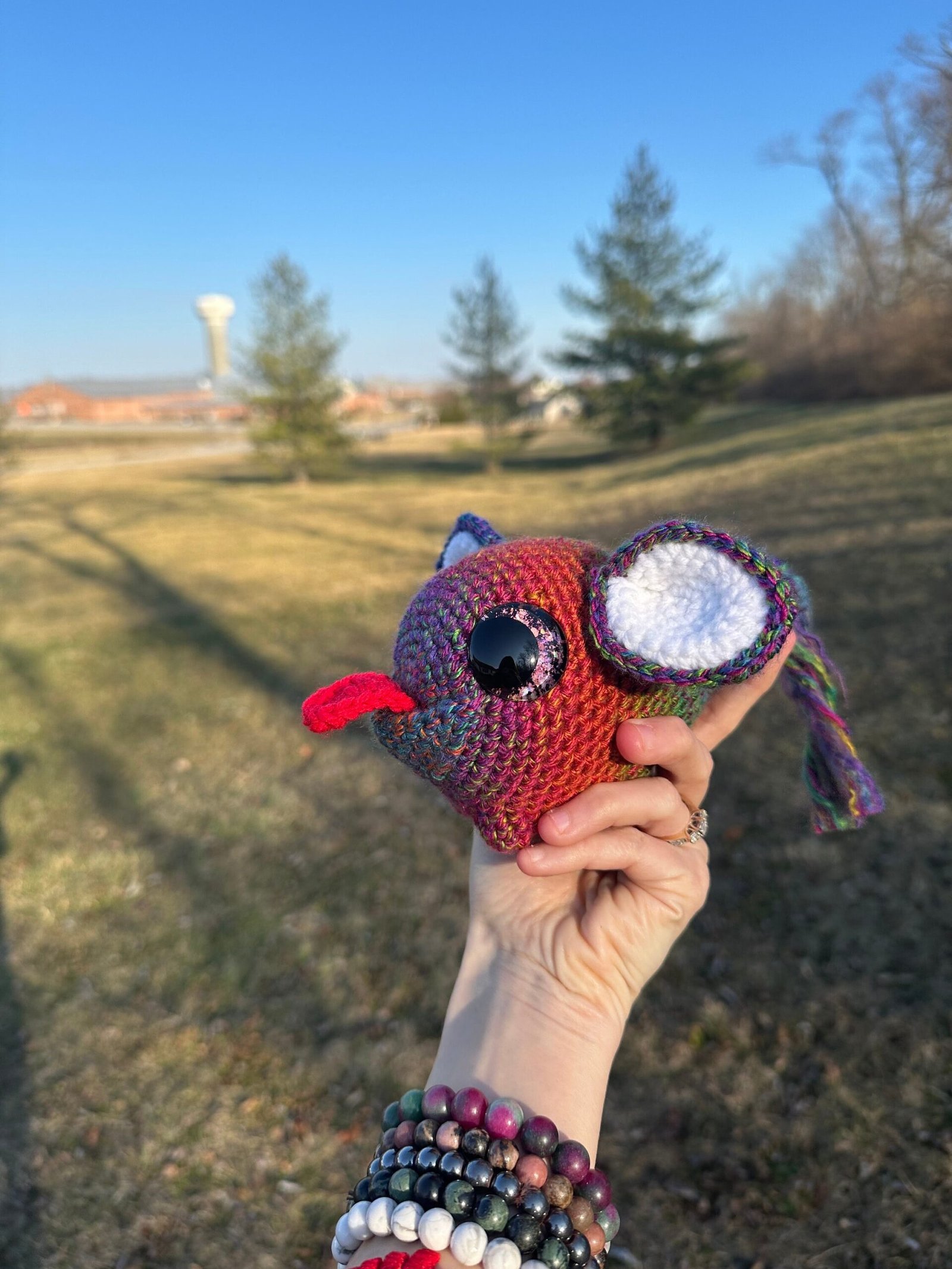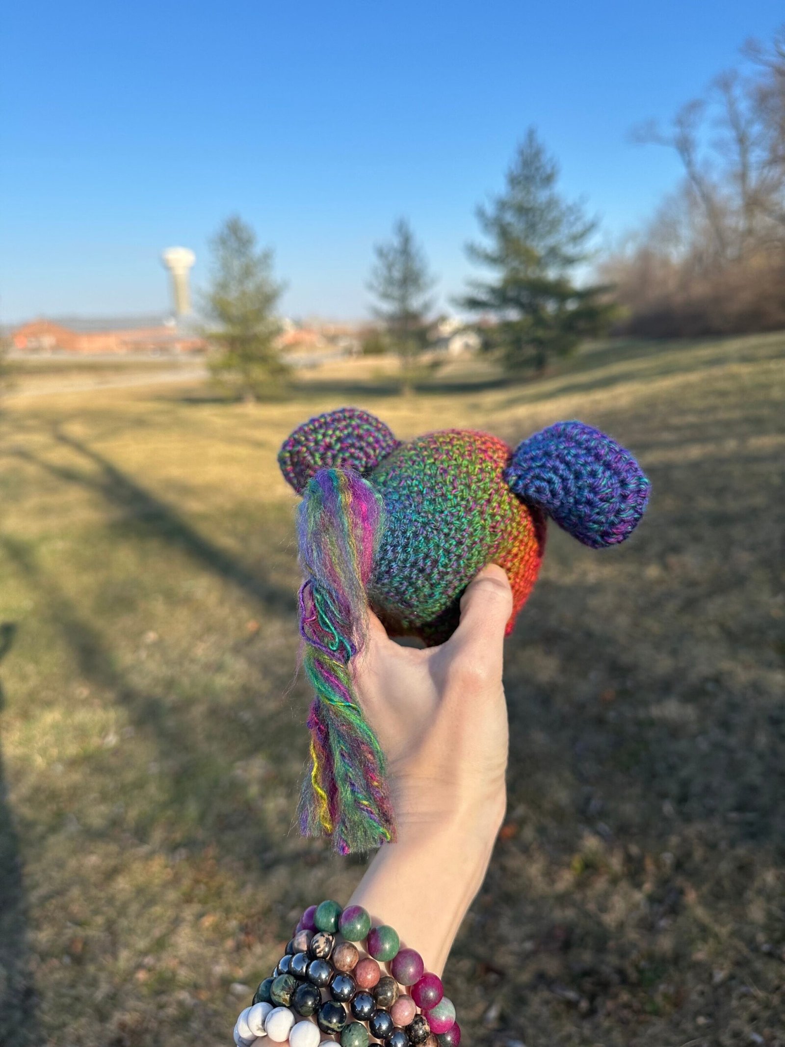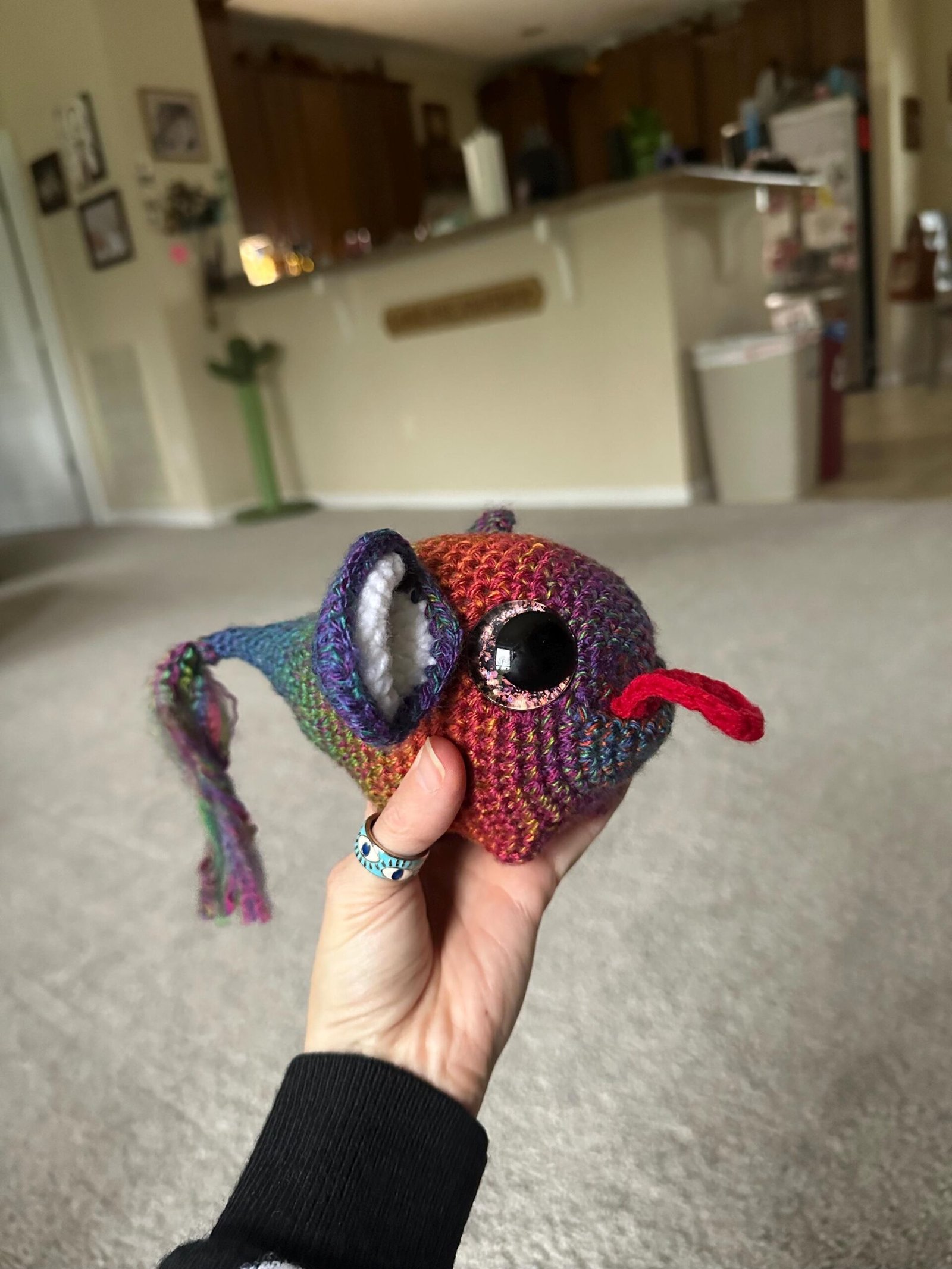He’s super cute with multi colored yarn colored with a red tongue and adorable mouse ears. He has amazing holographic eyes painted by myself. This item is NOT meant to be a child’s toy.