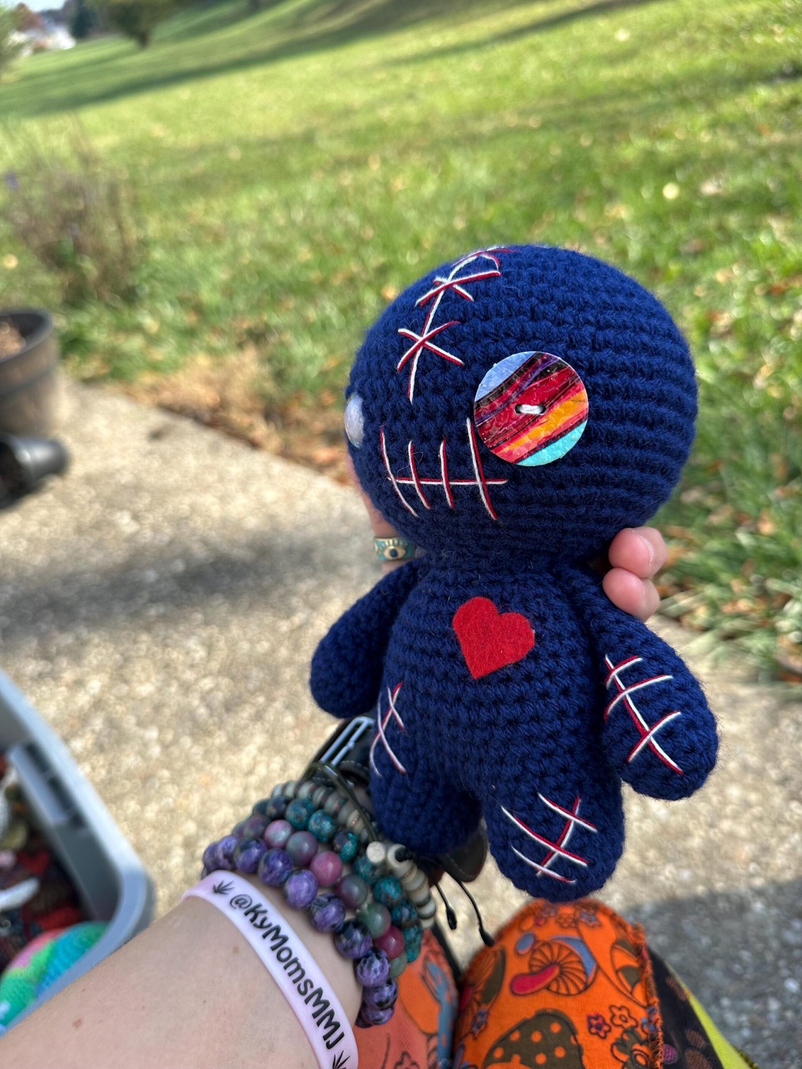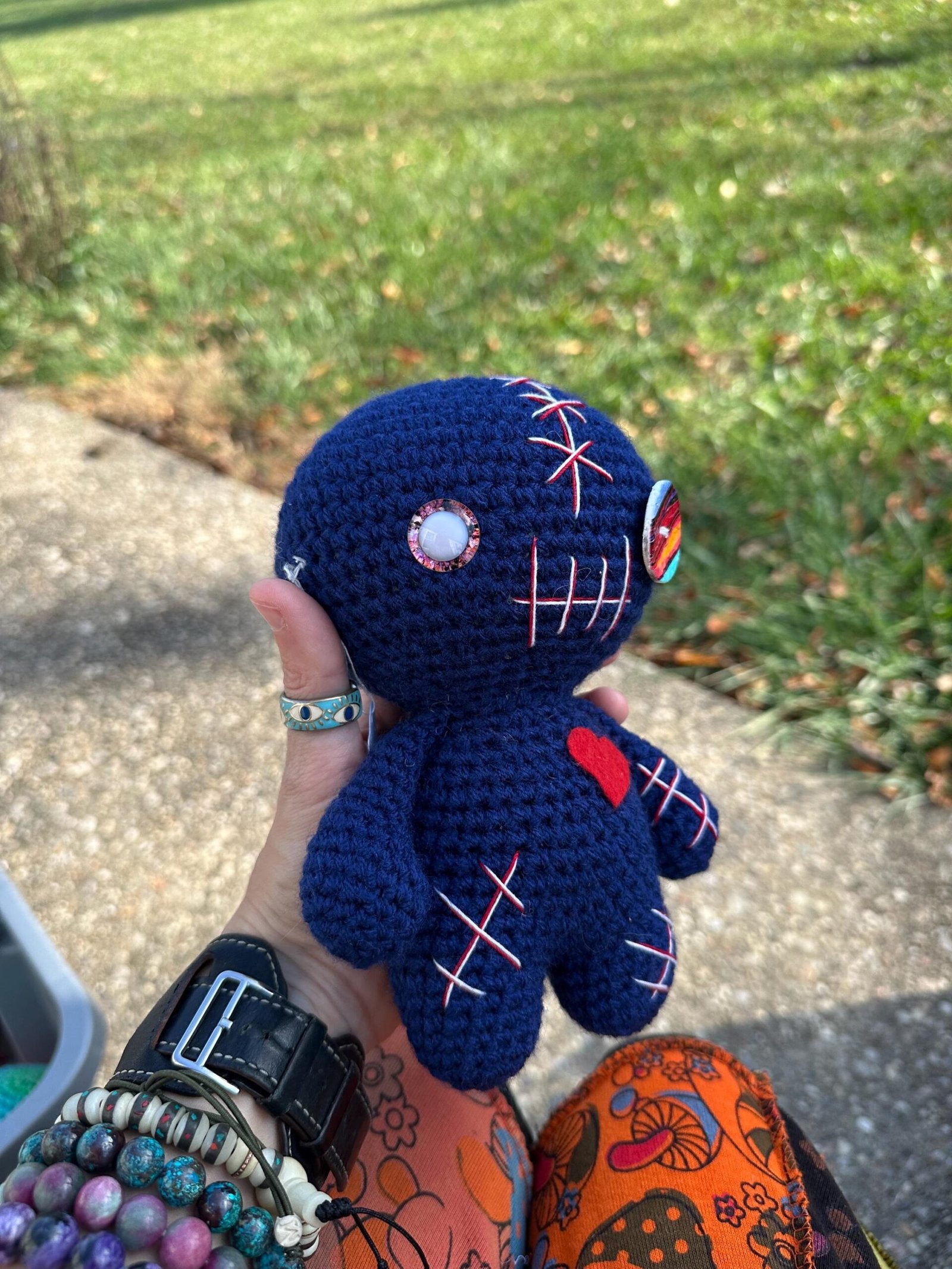 This crochet voodoo doll amigurumi features tight, even stitches, embroidered accents, a felt heart, and one of my hand-painted safety eyes—giving him a truly expressive and original look. He is soft, durable, and full of personality.