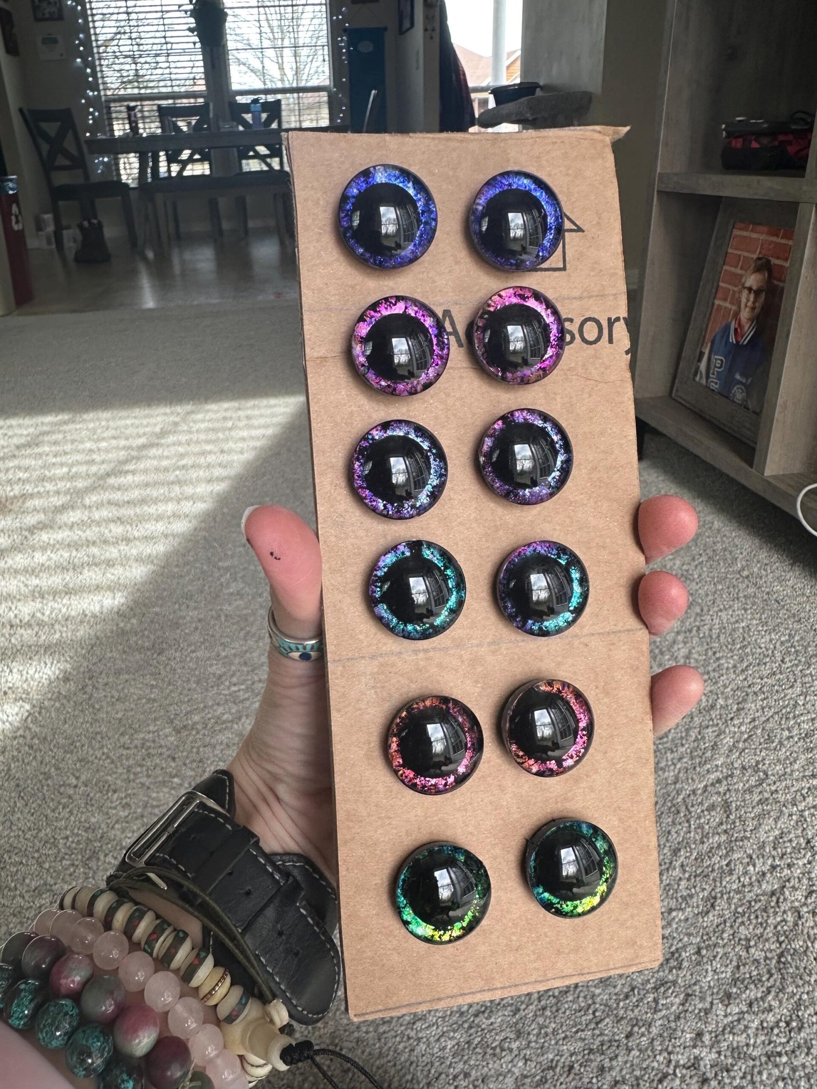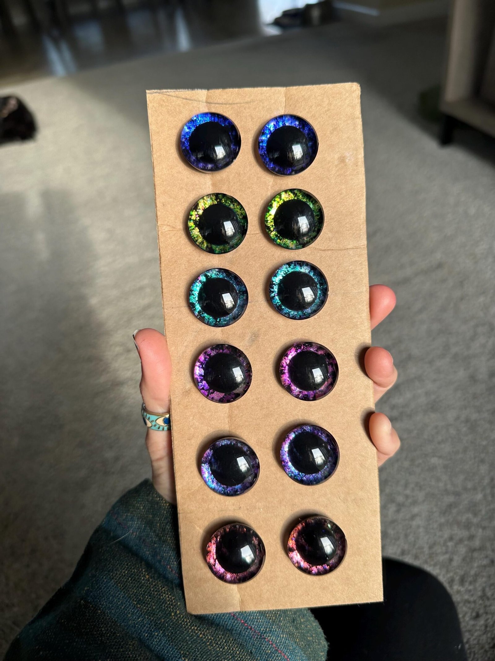 MADE TO ORDER! This is a listing for 6 sets of black pupil safety eyes. These safety eyes are handpainted by myself. There are blue, green, pink, dark blue, red/orange, and a blue pink holographic eyes. Check out the video above to see how the colors change. These eyes are 24mm each pair includes two backs. If you have any questions, feel free to message me. Colors will vary as these are HAND PAINTED.