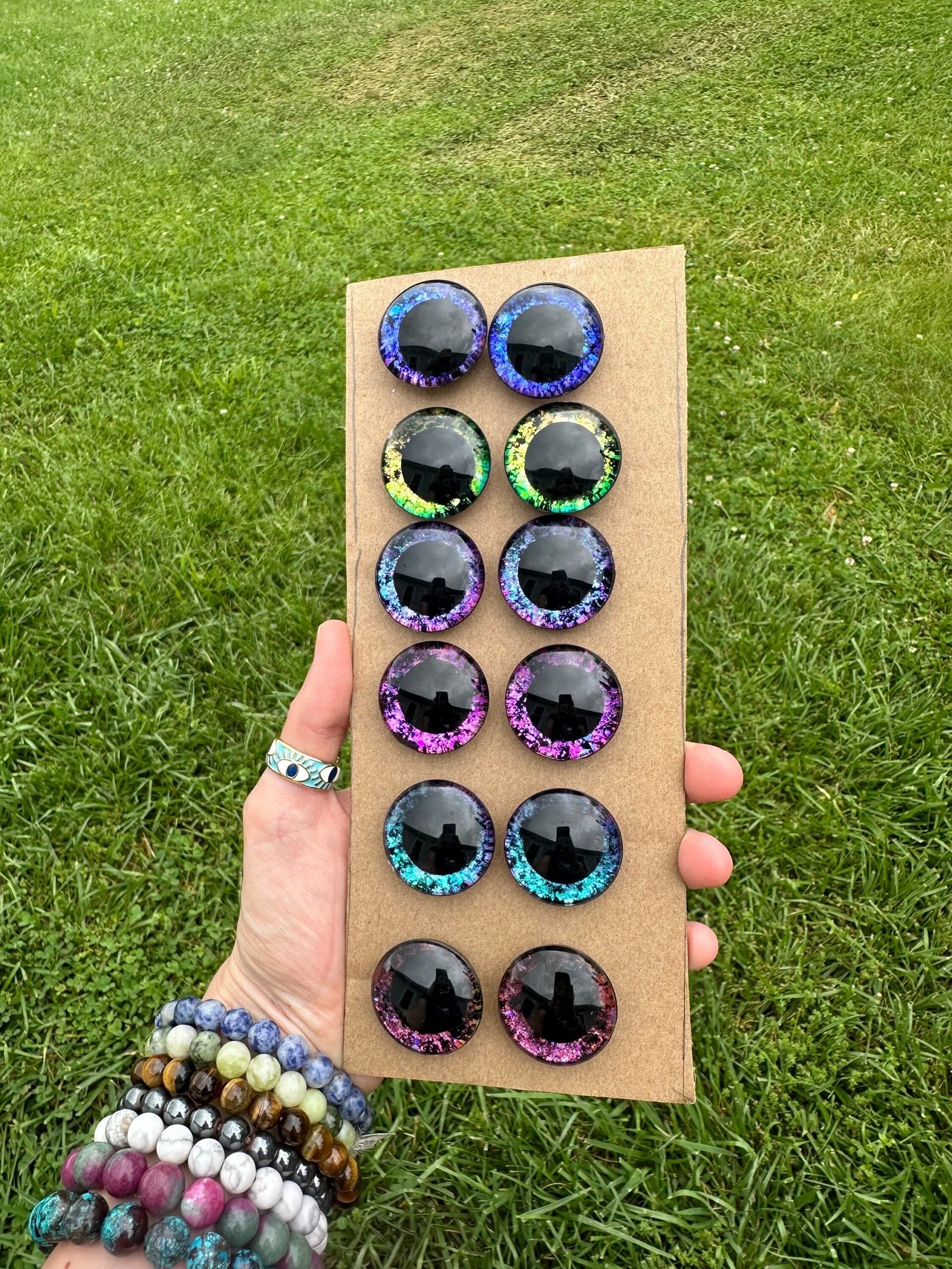 Made to order. This is a listing for 6 sets of black pupil safety eyes. These safety eyes are handpainted by myself. There are blue, green, pink, dark blue, red/orange, and a blue pink holographic eyes. Check out the video above to see how the colors change. These eyes are 30mm each pair includes two backs. If you have any questions, feel free to message me.