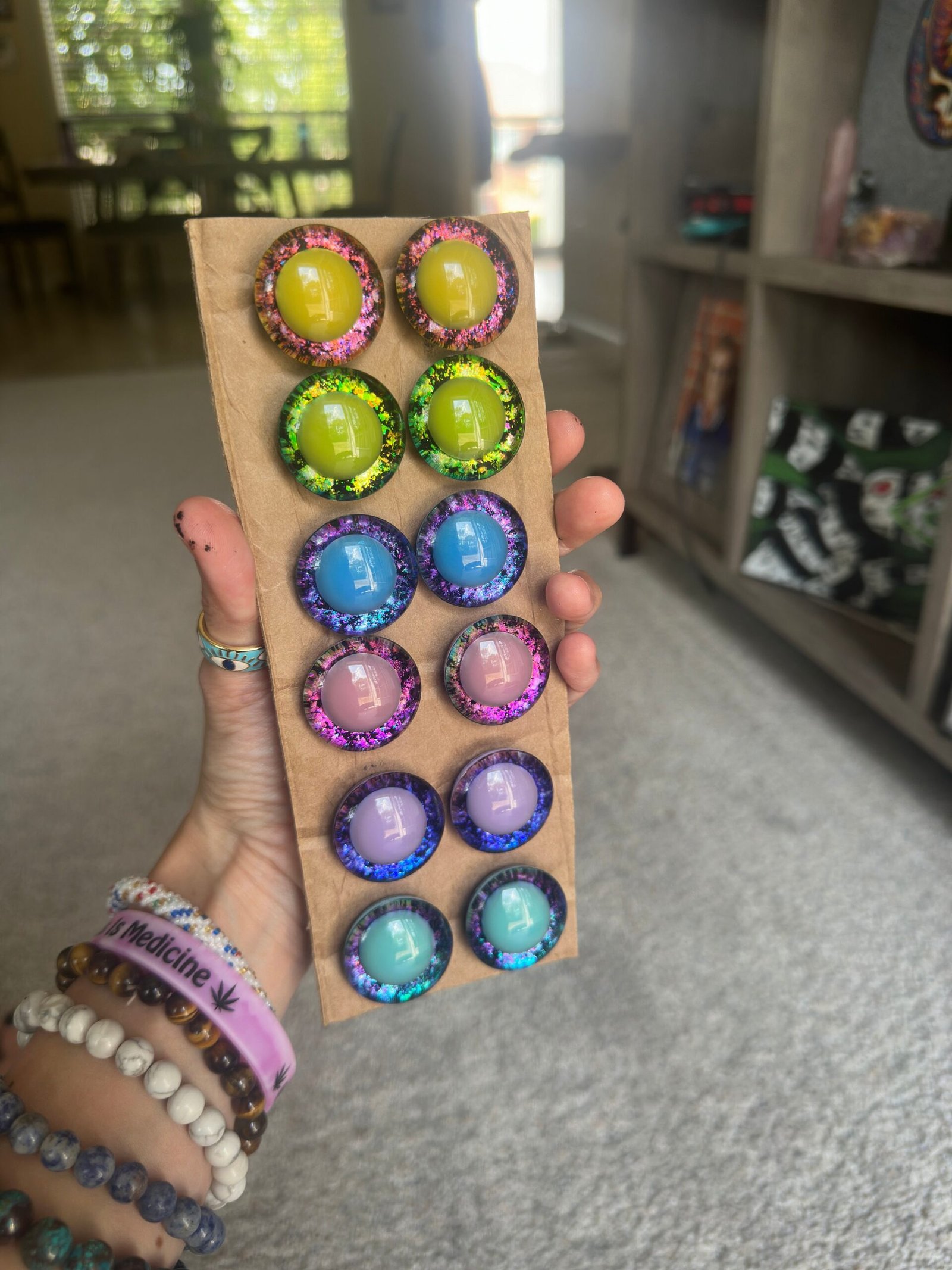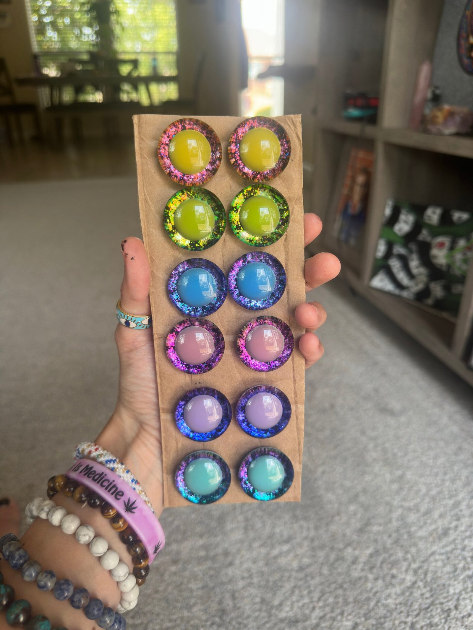 This is a listing for 6 sets of pastel rainbow pupil safety eyes. These safety eyes are handpainted by myself. There are blue, green, pink, dark blue, turquoise, yellow holographic eyes. Check out the video above to see how the colors change. These eyes are 30mm each pair includes two backs. If you have any questions, feel free to message me.
