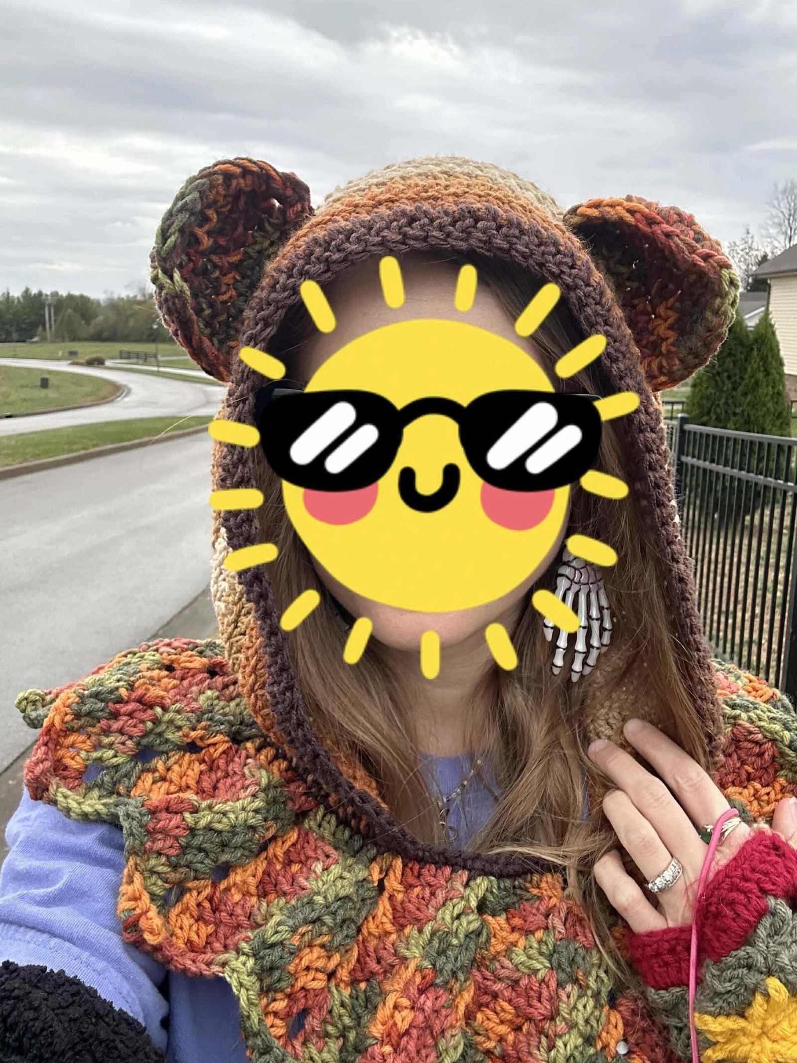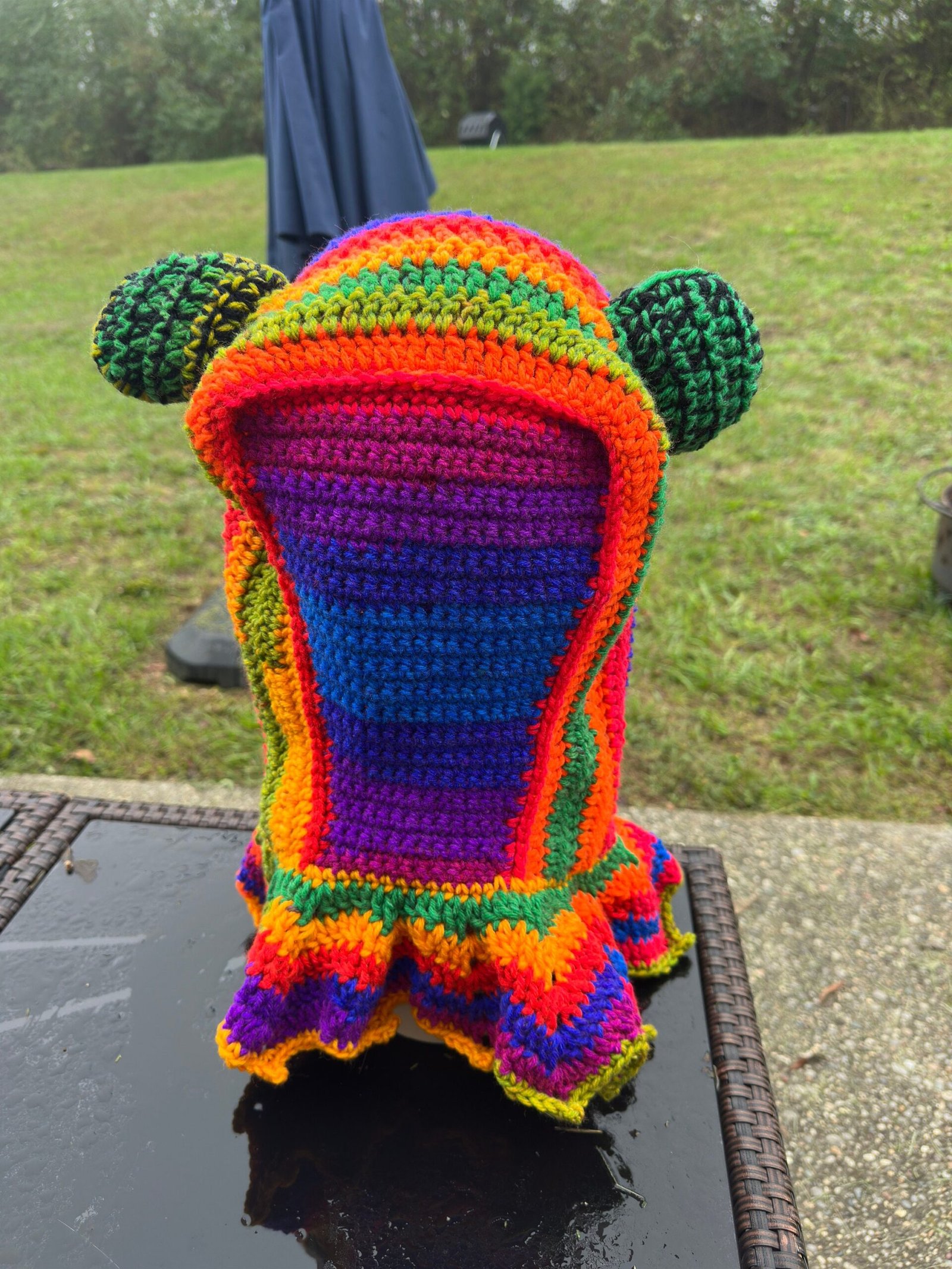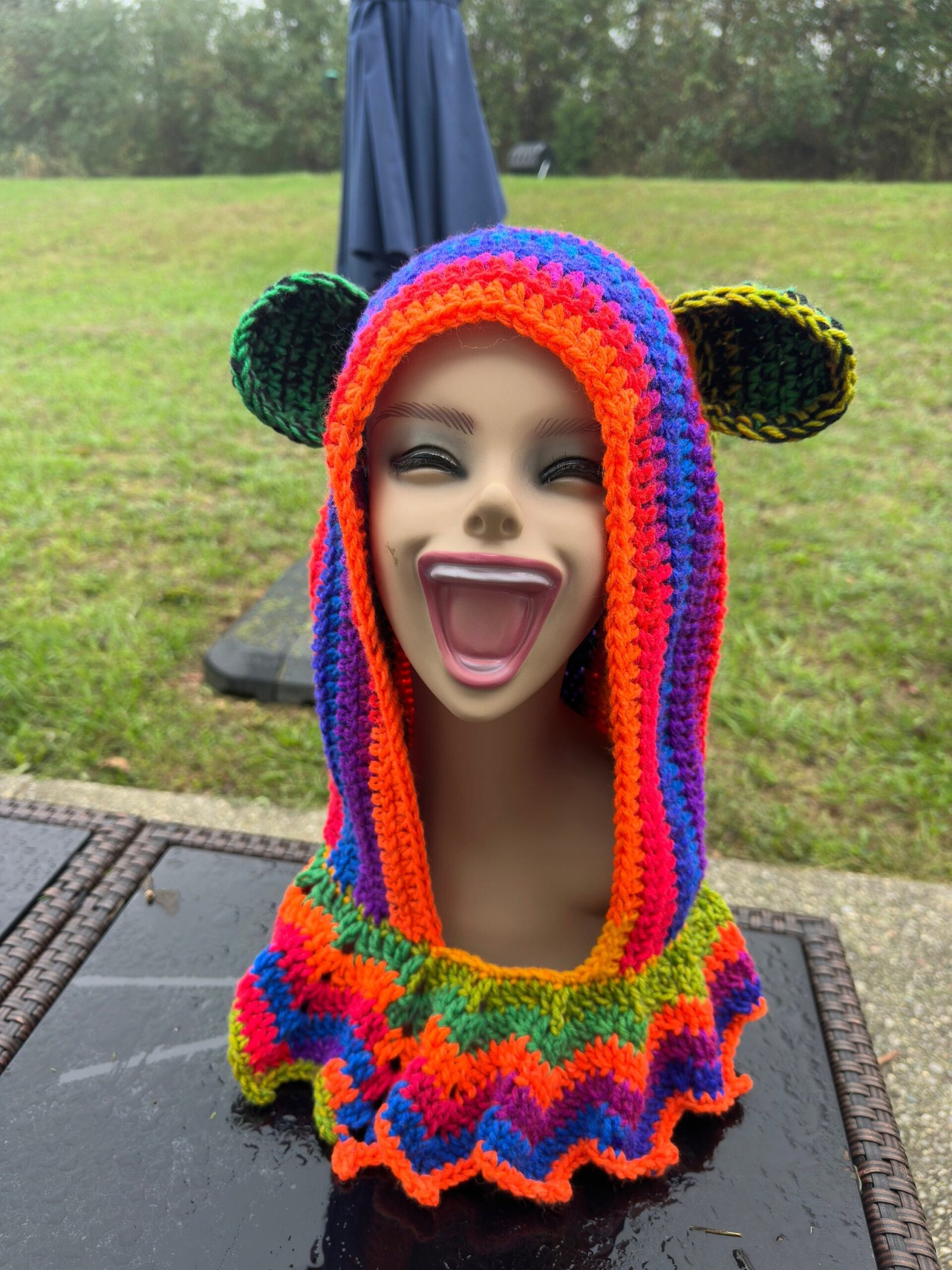 Step into the world of whimsy and warmth with our handcrafted crochet hood, inspired by the iconic Grateful Dead dancing bear! Each stitch of this unique hood has been meticulously crocheted with love, featuring an explosion of bright colors that embody the free spirit and joy of the music that inspired it. Adorned with playful ears and a cozy, comfortable fit, this hood is not just an accessory, it’s a statement piece that tells a story of musical heritage and creative expression.